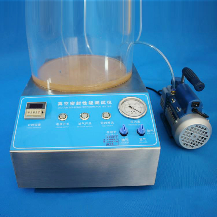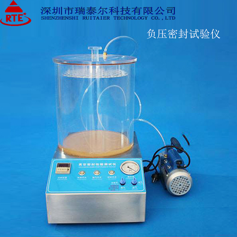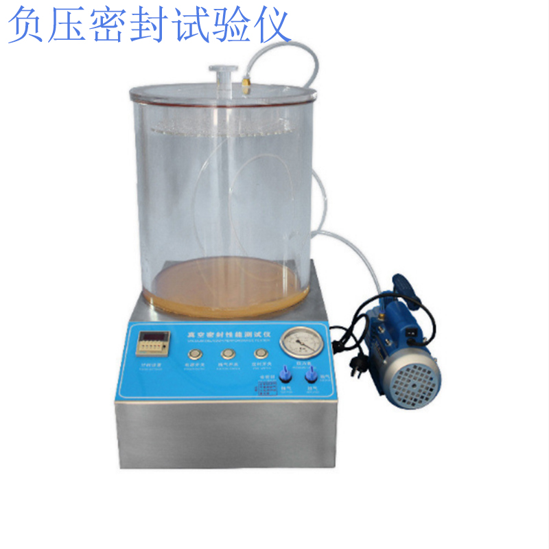 通過對真空室抽真空,使浸在水中的試樣產(chǎn)生內(nèi)外壓差,觀測試樣內(nèi)氣體外逸情況,以此判定試樣的密封性能;通過對真空室抽真空,使試樣產(chǎn)生內(nèi)外壓差,觀測試樣膨脹及釋放真空后試樣形狀恢復(fù)情況,以此判定試樣的密封性能。